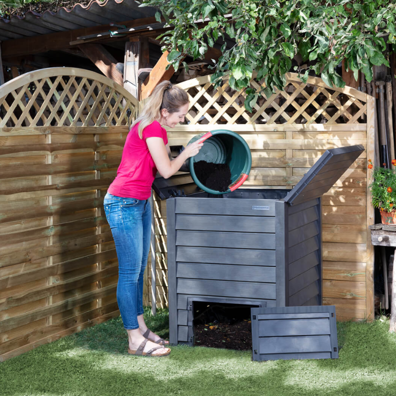 Thermo-Wood to estetyczny i funkcjonalny kompostownik ogrodowy z zewnętrzną strukturą imitującą drewno, dostosowany do gromadzenia i przetwarzania biodegradowalnych odpadów. Wyposażony w praktyczne drzwi i system wentylacji, zapewnia idealną wilgotność nawet przy dużych ilościach materiału organicznego. Dzięki spienionej strukturze tworzywa Thermolen® skutecznie utrzymuje ciepło wewnątrz kompostownika, co przyspiesza kompostowanie. Co więcej tworzywo to jest odporne na słońce i zmienne warunki pogodowe zapewnia długą żywotność produktu, a jednocześnie powstaje w całości z recyklingu i może być ponownie przetwarzane.