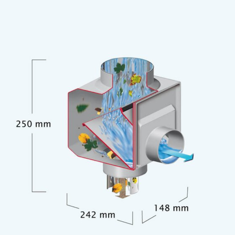 Zbieracz Kompakt umożliwia napełnianie zbiornika deszczówką, natomiast po jego zapełnieniu nadmiar wody kierowany jest dalej rurą spustową. Dzięki temu system działa stabilnie i bezpiecznie nawet podczas intensywnych opadów. Prosta konstrukcja wpływa na bezawaryjne użytkowanie oraz łatwe czyszczenie.